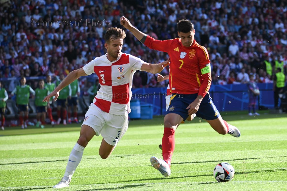 Чемпионат Европы по футболу 2024. Групповой этап. Матч между сборными командами Испании и Хорватии на Олимпийском стадионе. Игрок сборной Испании Альваро Мората (слева) и игрок сборной Хорватии Марин Понграчич (справа) во время матча.