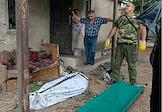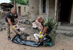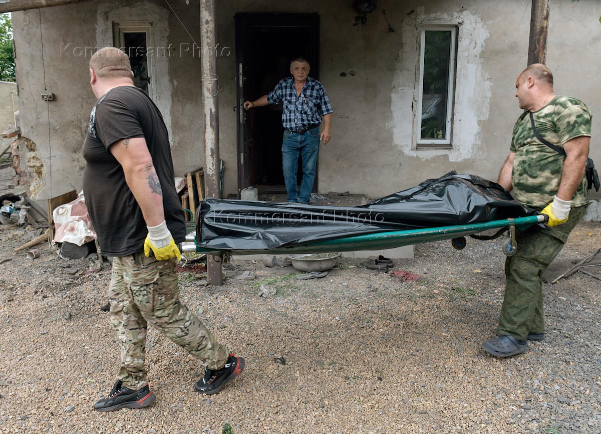 Последствия обстрела Петровского района Донецка, где погибла пожилая пара. Сотрудники ритуальной службы у тела погибшего.