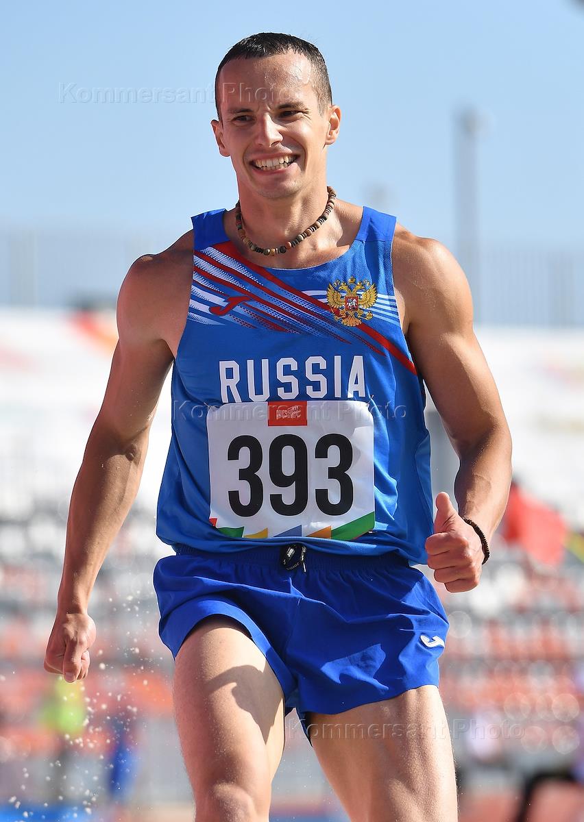 Спортивные игры стран БРИКС. Соревнования по легкой атлетике на стадионе "Центральный". Эстафета 4x400. Мужчины. Финальный забег. Российский спортсмен Дмитрий Разумов на старте забега.