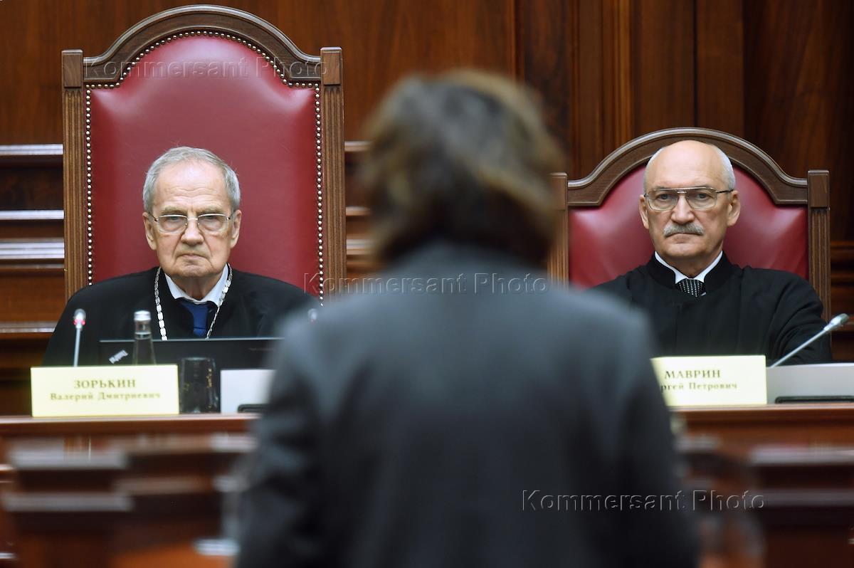 Заседание Конституционного суда России. Слушание дела о проверке конституционности положений части 4 статьи 7, абзаца первого части 1 и части 7 статьи 18 Федерального закона (ФЗ) "Об ответственном обращении с животными и о внесении изменений в отдельные законодательные акты РФ". Председатель Конституционного Суда России Валерий Зорькин (слева) и заместитель председателя Конституционного Суда России Сергей Маврин (справа) во время заседания.