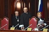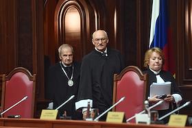 Заседание Конституционного суда России. Слушание дела о проверке конституционности положений части 4 статьи 7, абзаца первого части 1 и части 7 статьи 18 Федерального закона (ФЗ) "Об ответственном обращении с животными и о внесении изменений в отдельные законодательные акты РФ". Слева направо: председатель Конституционного Суда России Валерий Зорькин, заместитель председателя Конституционного Суда России Сергей Маврин и судья Конституционного суда России Людмила Жаркова во время заседания.