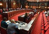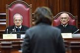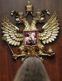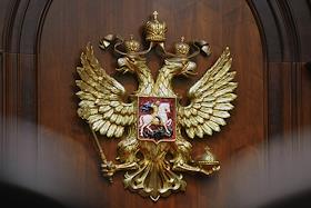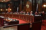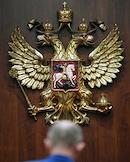 Заседание Конституционного суда России. Слушание дела о проверке конституционности положений части 4 статьи 7, абзаца первого части 1 и части 7 статьи 18 Федерального закона (ФЗ) "Об ответственном обращении с животными и о внесении изменений в отдельные законодательные акты РФ". Жанровая фотография. Герб России на стене.