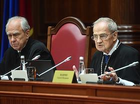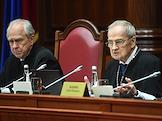 Заседание Конституционного суда России. Слушание дела о проверке конституционности положений части 4 статьи 7, абзаца первого части 1 и части 7 статьи 18 Федерального закона (ФЗ) "Об ответственном обращении с животными и о внесении изменений в отдельные законодательные акты РФ". Председатель Конституционного Суда России Валерий Зорькин (слева) и заместитель председателя Конституционного Суда России Сергей Маврин (справа) во время заседания.