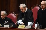 Заседание Конституционного суда России. Слушание дела о проверке конституционности положений части 4 статьи 7, абзаца первого части 1 и части 7 статьи 18 Федерального закона (ФЗ) "Об ответственном обращении с животными и о внесении изменений в отдельные законодательные акты РФ". Слева направо: судья Конституционного суда России Сергей Казанцев, председатель Конституционного Суда России Валерий Зорькин и заместитель председателя Конституционного суда России Сергей Маврин во время заседания.