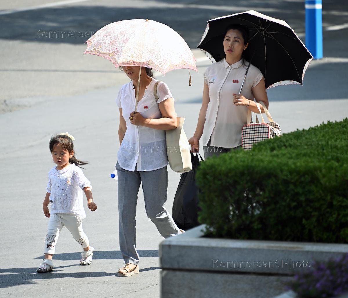 Виды Пхеньяна. Жанровая фотография. Женщины под зонтами от солнца.