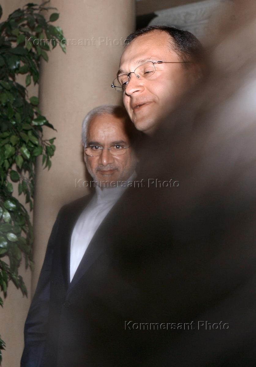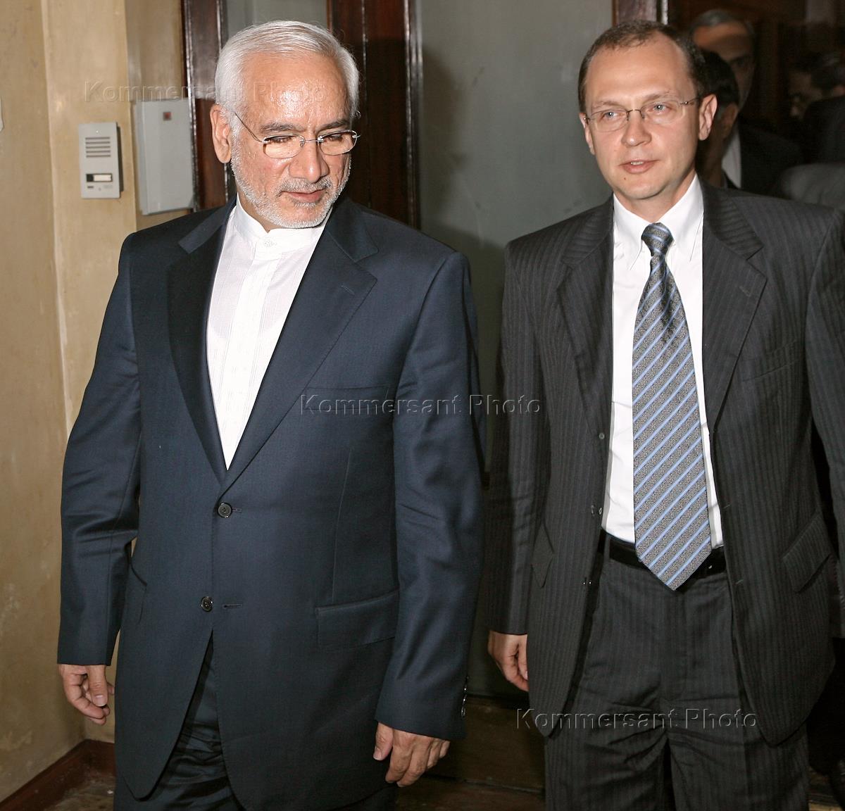 Руководитель Федерального агентства России по атомной энергии "Росатом" Сергей Кириенко (справа) и вице-президент Ирана Голям Реза Агазаде (слева) перед началом встречи в здании "Росатома".