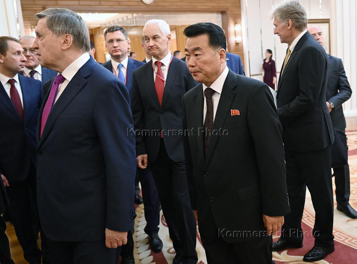 Working trip of Russian President Vladimir Putin to Pyongyang. Russian Defense Minister Andrei Belousov (center) before the start of Russian-Korean negotiations.