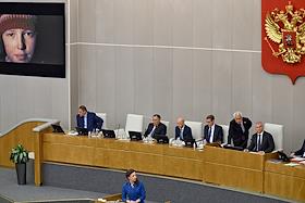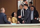 Пленарное заседание Государственной думы (ГД) России. Председатель Счетной палаты России Борис Ковальчук (в центре) и его первый заместитель Галина Изотова (вторая слева) перед началом заседания.