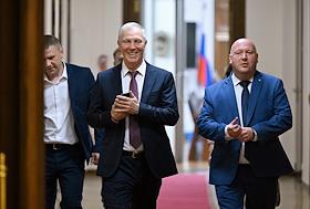 Пленарное заседание Государственной думы (ГД) России. Первый заместитель председателя комитета ГД России по туризму и развитию туристической инфраструктуры Николай Валуев (в центре) и первый заместитель председателя комитета ГД России по культуре Александр Шолохов (слева) во время заседания.