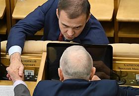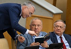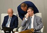 Пленарное заседание Государственной думы (ГД) России. Слева направо: председатель комитета ГД России по региональной политике и местному самоуправлению Алексей Диденко, член комитета ГД России по строительству и жилищно-коммунальному хозяйству Виталий Бахметьев и председатель комитета ГД России по труду, социальной политике и делам ветеранов Ярослав Нилов во время заседания.