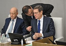 Пленарное заседание Государственной думы (ГД) России. Руководитель фракции "Единая Россия" в ГД России Владимир Васильев (слева) и председатель ГД России Вячеслав Володин (справа) во время заседания.