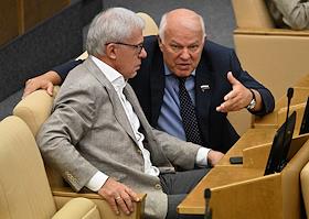 Пленарное заседание Государственной думы (ГД) России. Заместитель председателя комитета ГД России по экологии и охране окружающей среды Анатолий Грешневиков (справа) и первый заместитель председателя ГД России по экологии, природным ресурсам и охране окружающей среды Вячеслав Фетисов (слева) во время заседания.