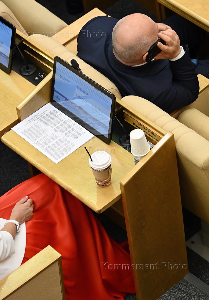 Пленарное заседание Государственной думы (ГД) России. Член комитет ГД России по развитию гражданского общества, вопросам общественных и религиозных объединений Сергей Петров во время заседания.