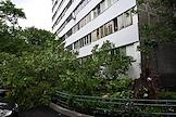 Последствия урагана в Москве. Жанровая фотография. Поваленное дерево перед жилым многоэтажным домом.