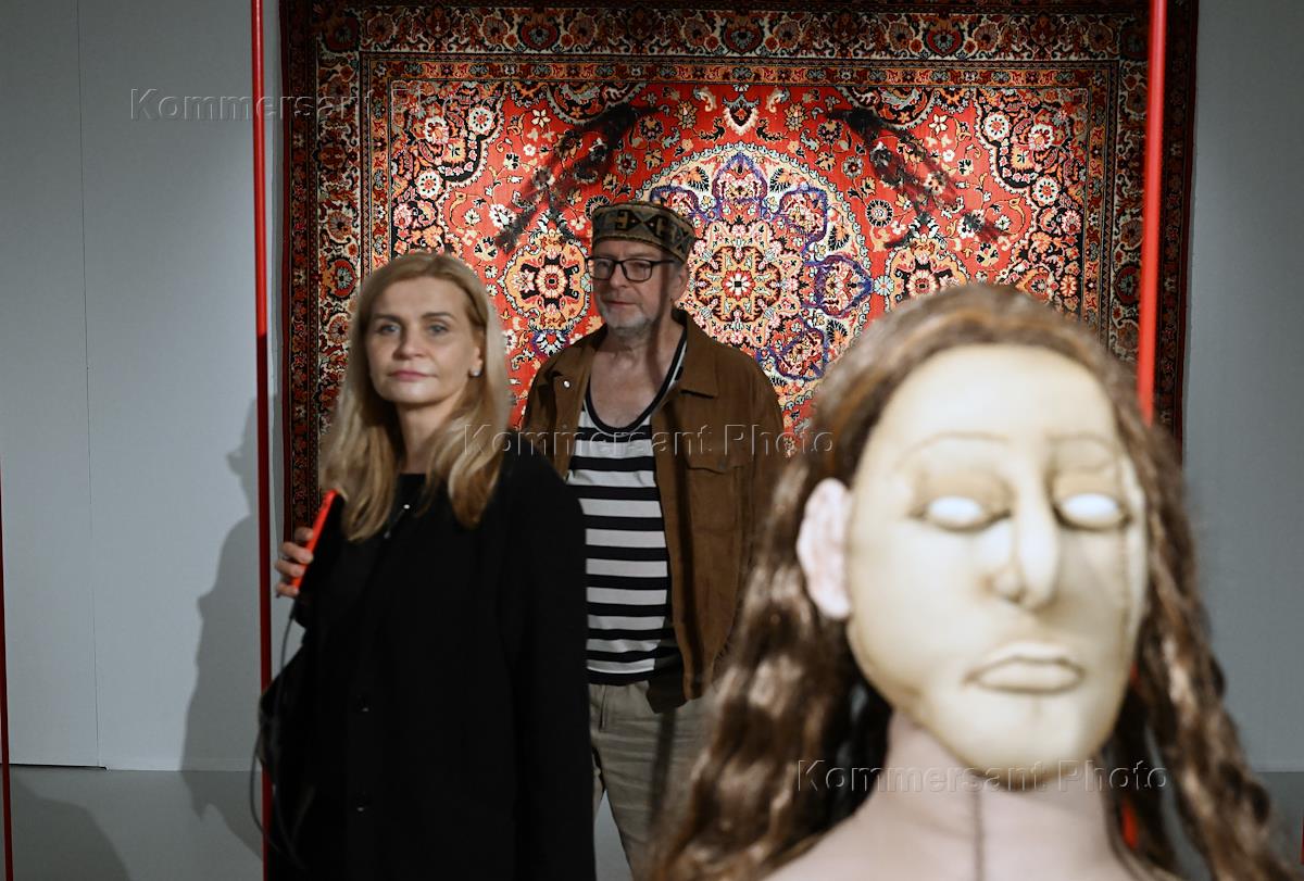Церемония открытия выставки "Нити. Ткань современного искусства" под кураторством галеристки Нины Гомиашвили в фонде Ruarts. Художник, модель Данила Поляков (слева) на церемонии.