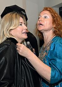 Церемония открытия выставки "Нити. Ткань современного искусства" под кураторством галеристки Нины Гомиашвили в фонде Ruarts. Куратор выставки Нина Гомиашвили (слева) и совладелица детского бутика Bonpoint Анна Андронова (справа) на церемонии.