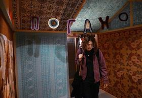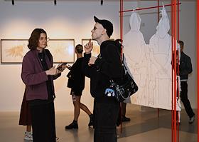 Церемония открытия выставки "Нити. Ткань современного искусства" под кураторством галеристки Нины Гомиашвили в фонде Ruarts. Художник, модель Данила Поляков (слева) на церемонии.