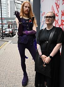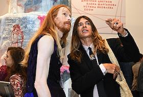 Церемония открытия выставки "Нити. Ткань современного искусства" под кураторством галеристки Нины Гомиашвили в фонде Ruarts. Стилист Влад Лисовец (справа) и художник, модель Данила Поляков (слева) на церемонии.