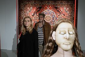 Церемония открытия выставки "Нити. Ткань современного искусства" под кураторством галеристки Нины Гомиашвили в фонде Ruarts. Модель Данила Поляков (справа) и дизайнер Константин Гайдай (слева) на церемонии.