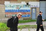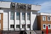Пресс-тур по Байкало-Амурской магистрали (БАМ). Виды города Новый Ургал. Жанровая фотография. Вывеска на стене дома - "Школа бокса Нового Ургала".