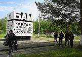 Пресс-тур по Байкало-Амурской магистрали (БАМ). Виды города Новый Ургал. Жанровая фотография. Декоративная конструкция с указанием расстояния до городов России.