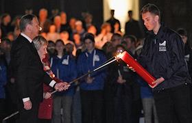 Всероссийская мемориальная акция "Свеча памяти", посвященная 83-й годовщине начала Великой Отечественной войны, на площади перед Музеем Победы. Ветеран Великой Отечественной Мария Рохлина (справа) и директор ФГБУК "Центральный музей Великой Отечественной войны 1941-1945 годов" Александр Школьник (слева) во время церемонии передачи частицы Вечного огня участникам акции.