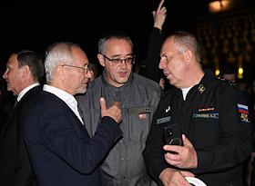 Всероссийская мемориальная акция "Свеча памяти", посвященная 83-й годовщине начала Великой Отечественной войны, на площади перед Музеем Победы. Председатель Московской городской думы Алексей Шапошников (второй справа), депутат Московской городской Думы, художественный руководитель театра Сатиры и театра на Малой Ордынке Евгений Герасимов (второй слева) и заместитель председателя — начальник отдела физической культуры и спорта ДОСААФ Москвы Андрей Олейник (справа) во время акции.