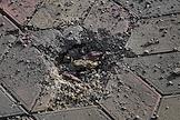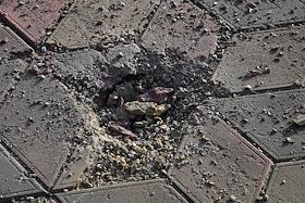 Последствия ракетного удара ВСУ по Севастополю оперативно-тактическими ракетами ATACMS, снаряженными кассетными боевыми частями. Городской пляж Учкуевка, где находились люди в момент атаки. В результате обстрела есть погибшие и раненые. След от снаряда на тротуарной плитке.