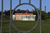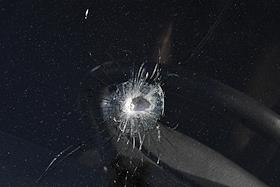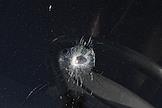 Последствия ракетного удара ВСУ по Севастополю оперативно-тактическими ракетами ATACMS, снаряженными кассетными боевыми частями. Городской пляж Учкуевка, где находились люди в момент атаки. В результате обстрела есть погибшие и раненые. Жанровая фотография. След от обстрела на стекле автомобиля.