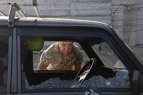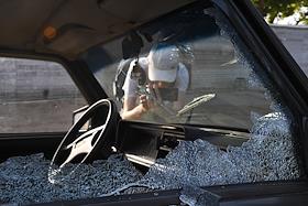 Последствия ракетного удара ВСУ по Севастополю оперативно-тактическими ракетами ATACMS, снаряженными кассетными боевыми частями. Городской пляж Учкуевка, где находились люди в момент атаки. В результате обстрела есть погибшие и раненые. Жанровая фотография. Разбитые стекла в салоне автомобиля после попадания снаряда.