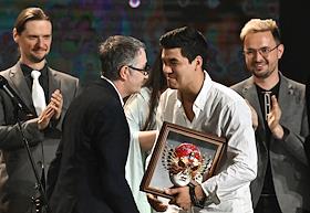 XXX церемония вручения Российской национальной театральной премии "Золотая Маска" по итогам сезона 2022-2023 в Государственном академическом театре имени Евгения Вахтангова. Актер Алан Албегов (справа), победивший в номинации "Лучший актер в драматическом спектакле".