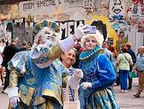 Карнавальное шествие "Театральный Арбат", организованное Союзом театральных деятелей (СТД) России в преддверии церемонии награждения лауреатов ХХХ Российской национальной театральной премии "Золотая маска" в Государственном академическом театре имени Евгения Вахтангова, на Арбате. Жанровая фотография.