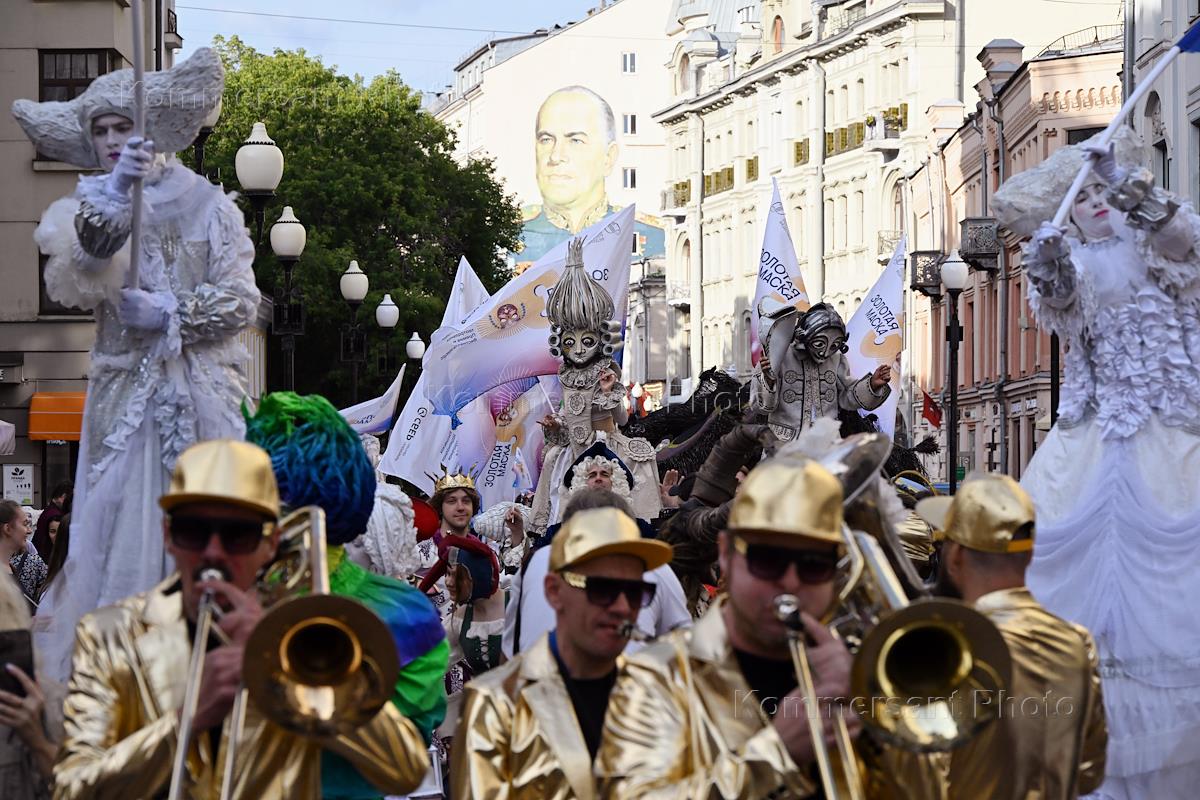 Карнавальное шествие "Театральный Арбат", организованное Союзом театральных деятелей (СТД) России в преддверии церемонии награждения лауреатов ХХХ Российской национальной театральной премии "Золотая маска" в Государственном академическом театре имени Евгения Вахтангова, на Арбате.