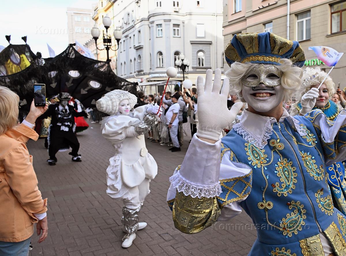 Карнавальное шествие "Театральный Арбат", организованное Союзом театральных деятелей (СТД) России в преддверии церемонии награждения лауреатов ХХХ Российской национальной театральной премии "Золотая маска" в Государственном академическом театре имени Евгения Вахтангова, на Арбате.