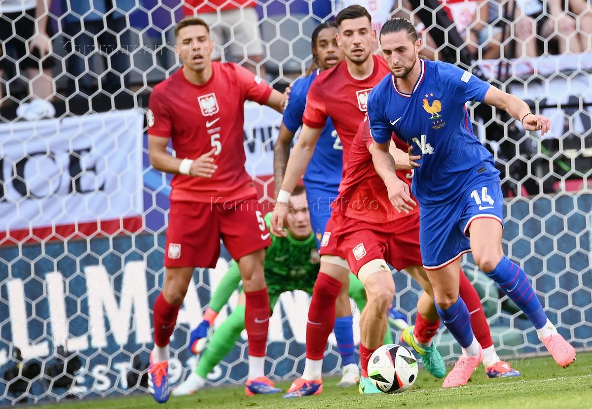 Чемпионат Европы по футболу 2024. 3-й тур. Группа D. Матч между сборными командами Франции и Польши на стадионе "Сигнал Идуна Парк". Игрок сборной команды Франции Адриен Рабьо (в центре) во время матча.