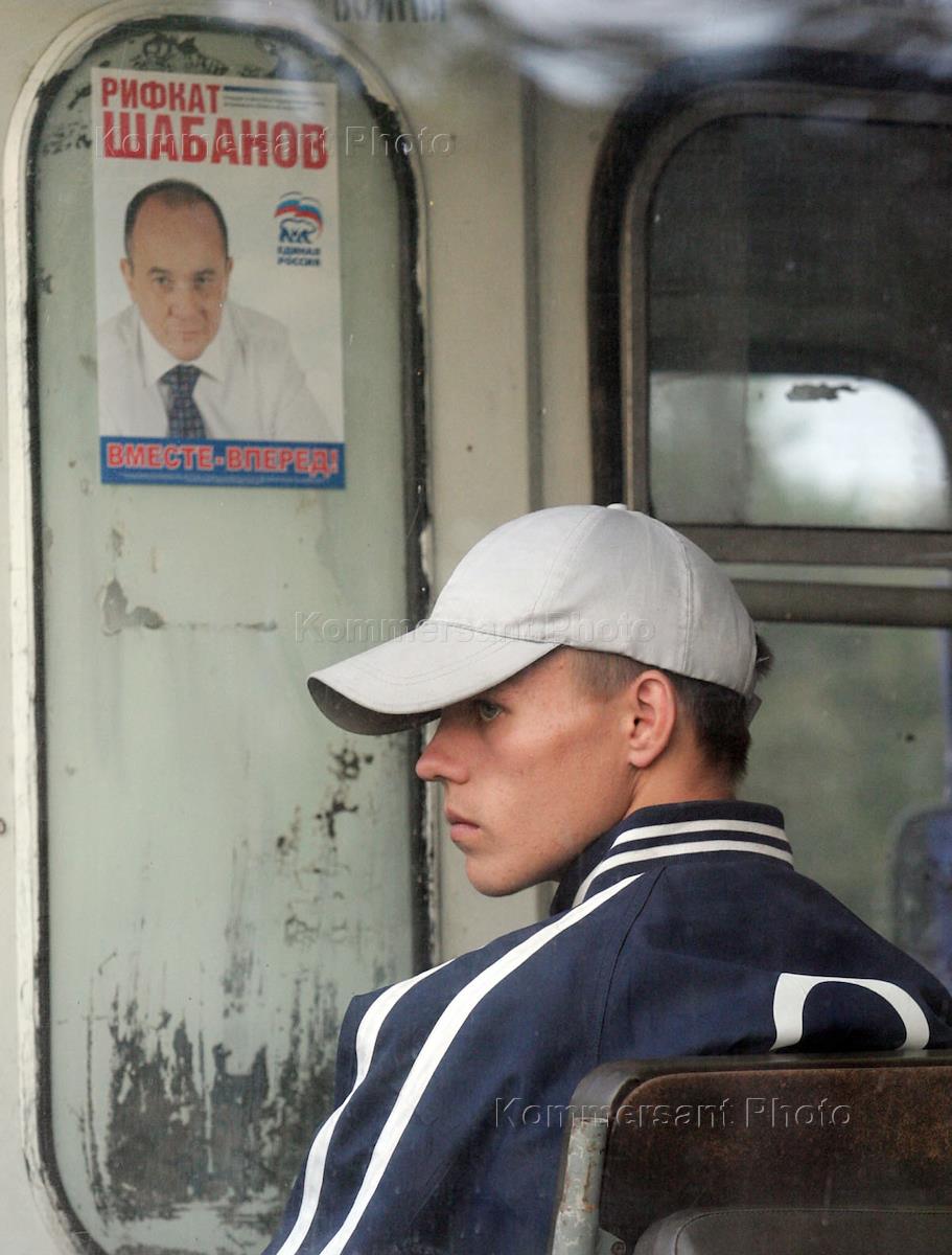 Подготовка к выборам депутатов областной думы, которые состоятся 8 октября 2006 года. Предвыборная агитация партии "Единая Россия" и кандидата Рифката Шабанова в общественном транспорте.