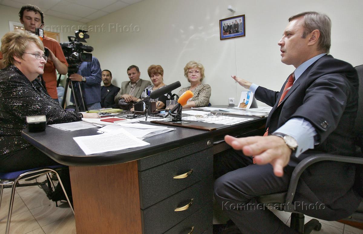 Лидер движения "Народно-демократический союз" (НДС) Михаил Касьянов (справа) во время заседания "круглого стола" в местном штабе НДС.