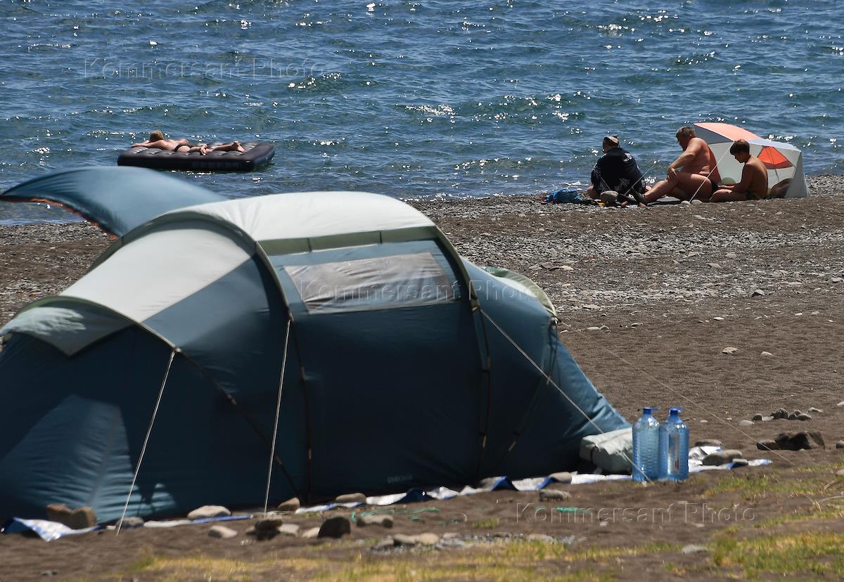 Жанровая фотография. Отдыхающие на территории необорудованных пляжах на Черном море. Палаточный городок на берегу.