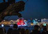 Генеральная репетиция общегородского праздника выпускников средних школ Санкт-Петербурга "Алые паруса". Жанровая фотография. Мужчина с домашней крысой на плече на набережной реки Невы во время репетиции.