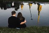 Генеральная репетиция общегородского праздника выпускников средних школ Санкт-Петербурга "Алые паруса". Жанровая фотография. Молодые люди сидят на берегу речного канала.