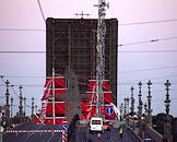 Генеральная репетиция общегородского праздника выпускников средних школ Санкт-Петербурга "Алые паруса". Жанровая фотография. Проход брига "Россия" по реке Неве через разведенный мост.