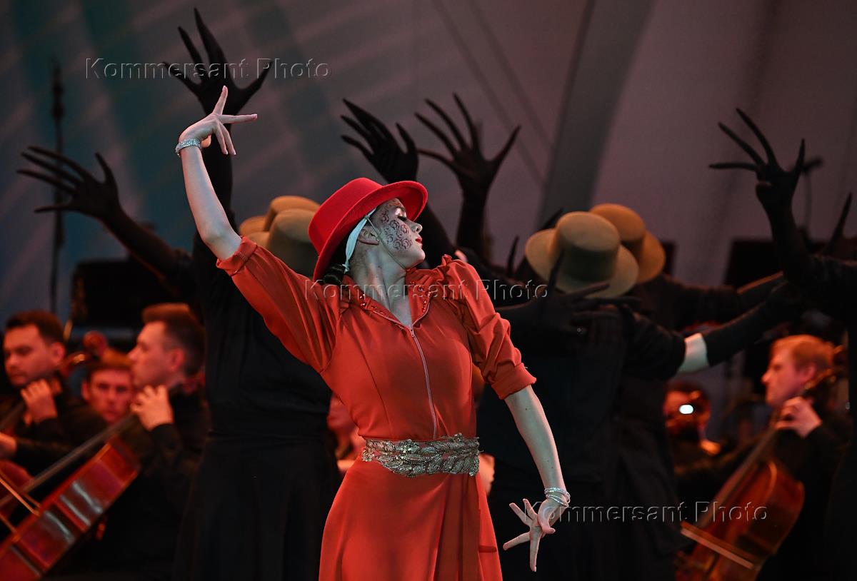 Балет "Жар-птица" композитора Игоря Стравинского в исполнении коллектива Banda I'll в постановке хореографа Артемия Манукяна в Большом амфитеатре Парка "Зарядье". Генеральный директор концертного зала "Зарядье", дирижер Иван Рудин (в центре) во время балета.
