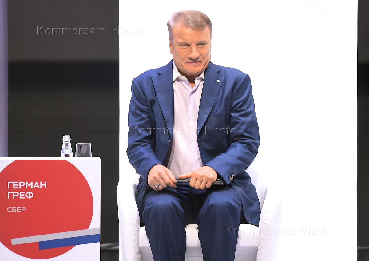 Финансовый конгресс Банка России в Большом концертном зале "Октябрьский". День первый. Пленарная сессия "Рост в условиях ограничений". Президент, председатель правления Сбербанка России Герман Греф во время сессии.