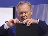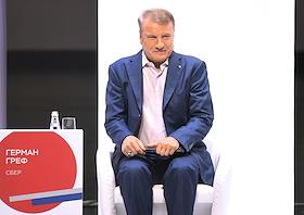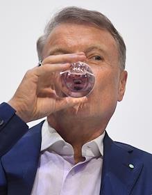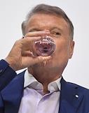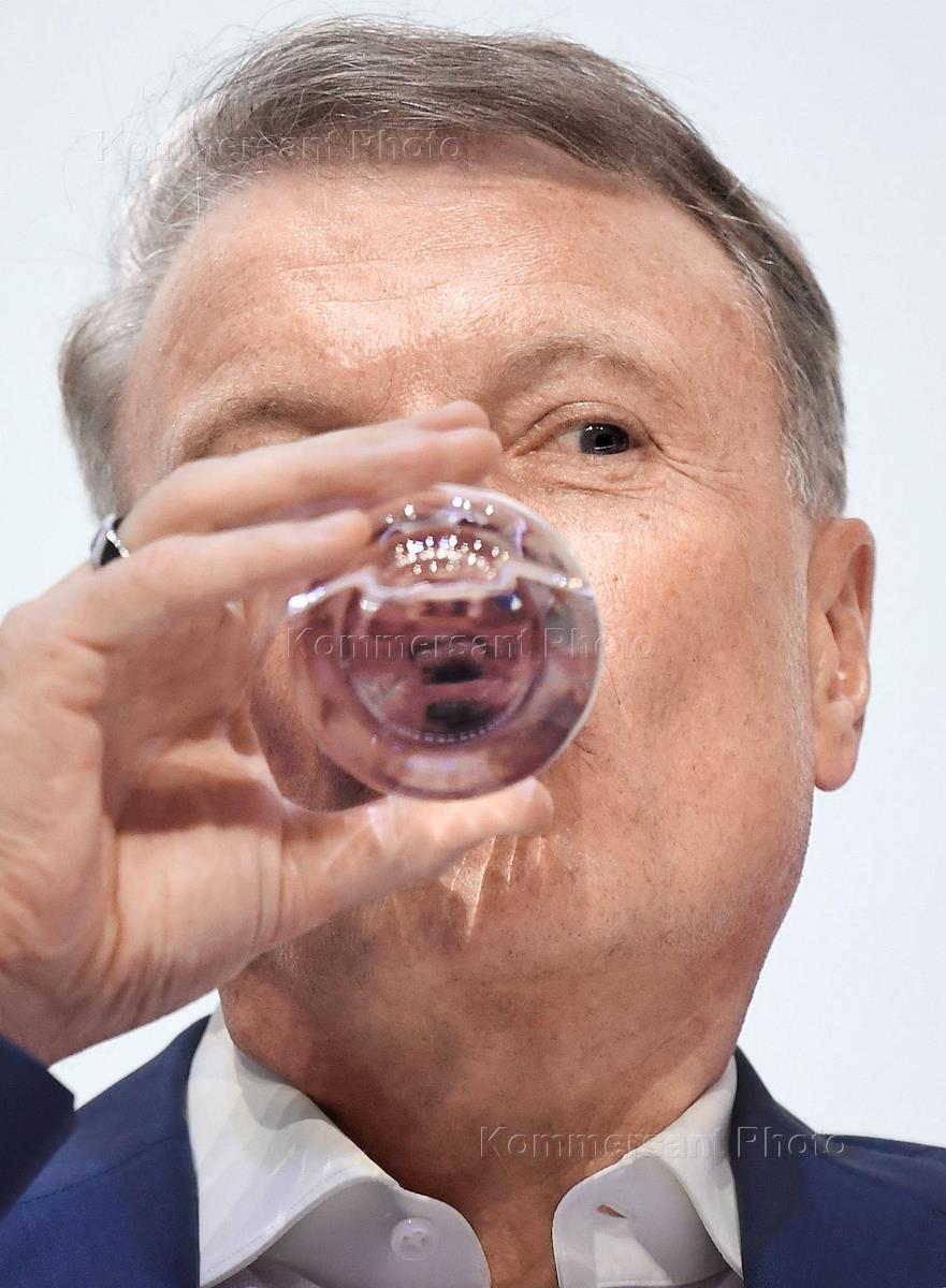 Финансовый конгресс Банка России в Большом концертном зале "Октябрьский". День первый. Пленарная сессия "Рост в условиях ограничений". Президент, председатель правления Сбербанка России Герман Греф во время сессии.