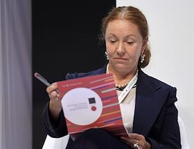 Финансовый конгресс Банка России в Большом концертном зале "Октябрьский". День первый. Пленарная сессия "Долгосрочные ресурсы для экономики - ключевой приоритет развития финансового рынка". Научный руководитель Центра Системных Трансформаций экономического факультета МГУ имени М.В.Ломоносова Анна Белова во время сессии.