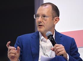 Финансовый конгресс Банка России в Большом концертном зале "Октябрьский". День первый. Пленарная сессия "Рост в условиях ограничений". Главный управляющий директор "Альфа-Банка" Владимир Верхошинский во время сессии.