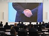 Рабочая поездка президента России Владимира Путина в Астану. Саммит Шанхайской организации сотрудничества (ШОС). Президент России Владимир Путин (на экране) на саммите.