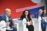 Финансовый конгресс Банка России на площадке Новой сцены Александринского театра. День третий. Слева направо: первый вице-президент АО "Газпромбанк" Екатерина Салугина-Сороковая, директор департамента по климатическим рискам Эн+ Алексей Спирин и главный советник генерального директора Российского энергетического агентства (РЭА) министерства энергетики России Владимир Дребенцов во время конгресса.