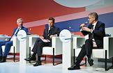 Финансовый конгресс Банка России на площадке Новой сцены Александринского театра. День третий. Сессия "Высокие процентные ставки в мире - это новая норма?". Слева направо: управляющий директор Департамента частно-банковского бизнеса АО "Газпромбанк" Егор Сусин, генеральный директор, соучредитель УК "Арикапитал" Алексей Третьяков и президент Центра международных отношений и устойчивого развития (CIRSD) Вук Еремич во время сессии.