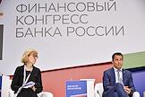Финансовый конгресс Банка России на площадке Новой сцены Александринского театра. День третий. Первый вице-президент АО "Газпромбанк" Екатерина Салугина-Сороковая (справа) и главный советник Генерального директора Российского энергетического агентства (РЭА) Министерства энергетики России Владимир Дребенцов (слева) во время конгресса.